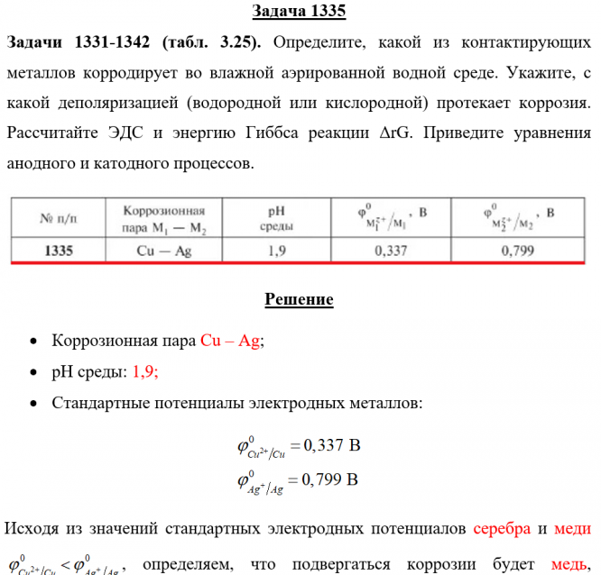 Задачи 1331-1342 (табл. 3.25). Определите, какой из контактирующих металлов корродирует во влажной аэрированной водной среде. Укажите, с какой деполяризацией (водородной или кислородной) протекает коррозия. Рассчитайте ЭДС и энергию Гиббса реакции ΔrG. Приведите уравнения анодного и катодного процессов..