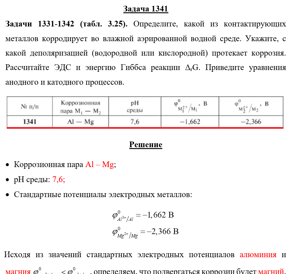 Задачи 1331-1342 (табл. 3.25). Определите, какой из контактирующих металлов корродирует во влажной аэрированной водной среде. Укажите, с какой деполяризацией (водородной или кислородной) протекает коррозия. Рассчитайте ЭДС и энергию Гиббса реакции ΔrG. Приведите уравнения анодного и катодного процессов..