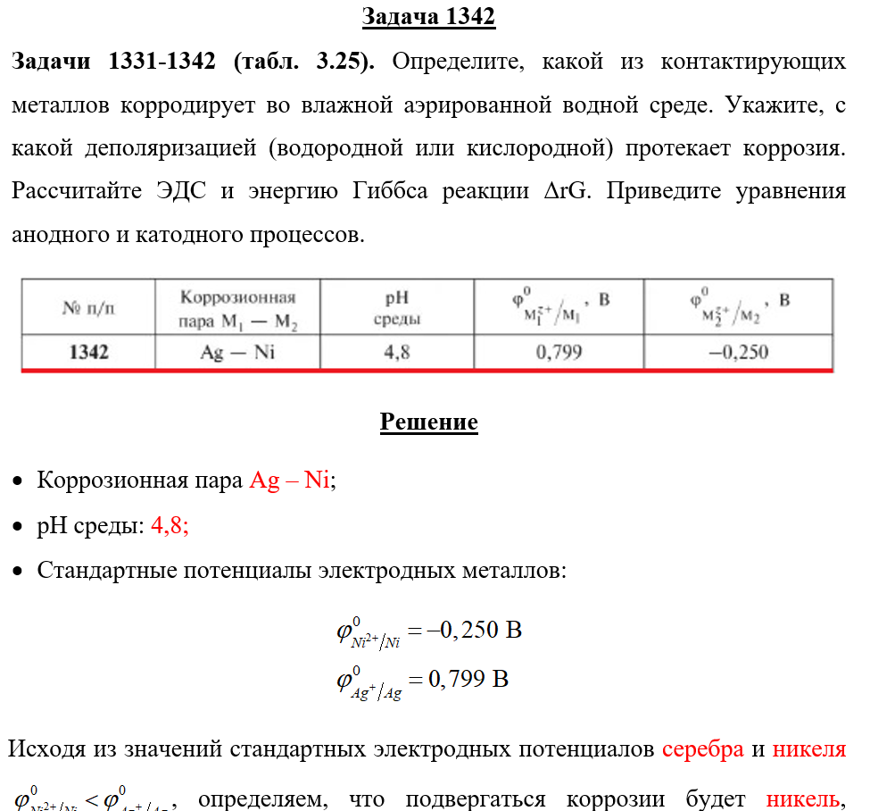 Задачи 1331-1342 (табл. 3.25). Определите, какой из контактирующих металлов корродирует во влажной аэрированной водной среде. Укажите, с какой деполяризацией (водородной или кислородной) протекает коррозия. Рассчитайте ЭДС и энергию Гиббса реакции ΔrG. Приведите уравнения анодного и катодного процессов..