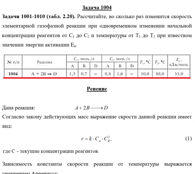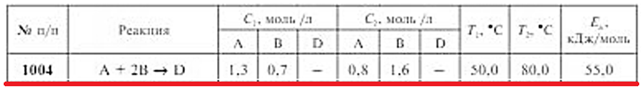 Задачи 1001-1010 (табл. 2.20). Рассчитайте, во сколько раз изменится скорость элементарной газофазной реакции при одновременном изменении начальной концентрации реагентов от C1 до C2 и температуры от Т1 до Т2 при известном значении энергии активации Ea.