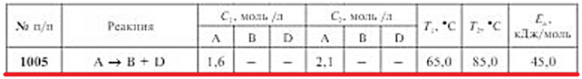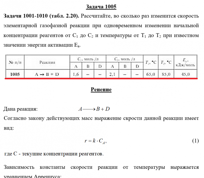 Задачи 1001-1010 (табл. 2.20). Рассчитайте, во сколько раз изменится скорость элементарной газофазной реакции при одновременном изменении начальной концентрации реагентов от C1 до C2 и температуры от Т1 до Т2 при известном значении энергии активации Ea.