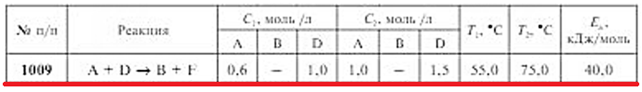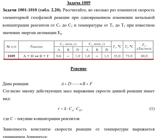 Задачи 1001-1010 (табл. 2.20). Рассчитайте, во сколько раз изменится скорость элементарной газофазной реакции при одновременном изменении начальной концентрации реагентов от C1 до C2 и температуры от Т1 до Т2 при известном значении энергии активации Ea.