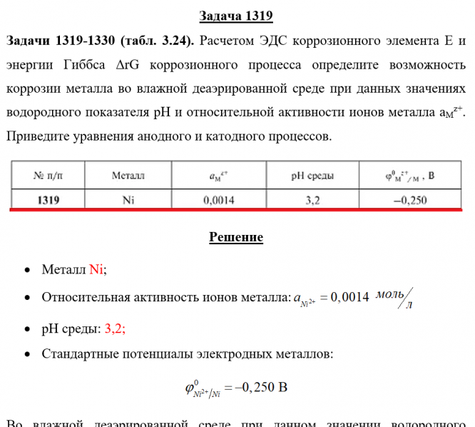 Главная » Учебные материалы » Химия » Решения задач » Несколько классов/семестров » Номер 1319 » Задача 1319 - Расчетом ЭДС коррозионного элемента Е и энергии Гиббса ΔrG коррозионного процесса определите возможность коррозии металла во влажной деаэрированной среде при данных значениях водородного показателя рН и относительной активности ионов ме