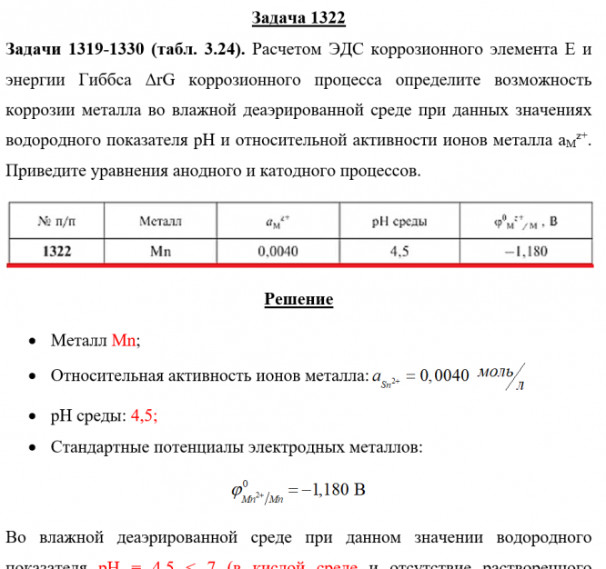 Задачи 1319-1330 (табл. 3.24). Расчетом ЭДС коррозионного элемента Е и энергии Гиббса ΔrG коррозионного процесса определите возможность коррозии металла во влажной деаэрированной среде при данных значениях водородного показателя рН и относительной активности ионов металла аМz+. Приведите уравнения анодного и катодного процессов..
