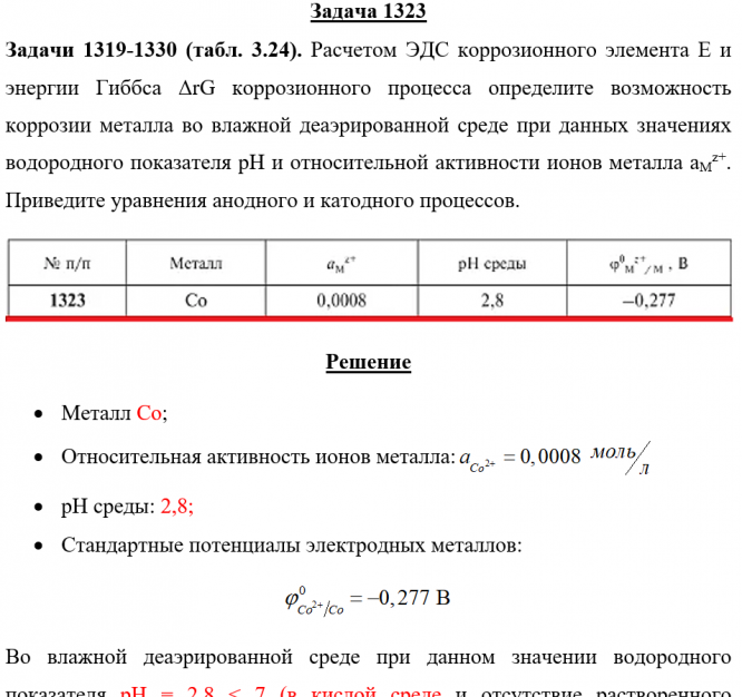 Задачи 1319-1330 (табл. 3.24). Расчетом ЭДС коррозионного элемента Е и энергии Гиббса ΔrG коррозионного процесса определите возможность коррозии металла во влажной деаэрированной среде при данных значениях водородного показателя рН и относительной активности ионов металла аМz+. Приведите уравнения анодного и катодного процессов..