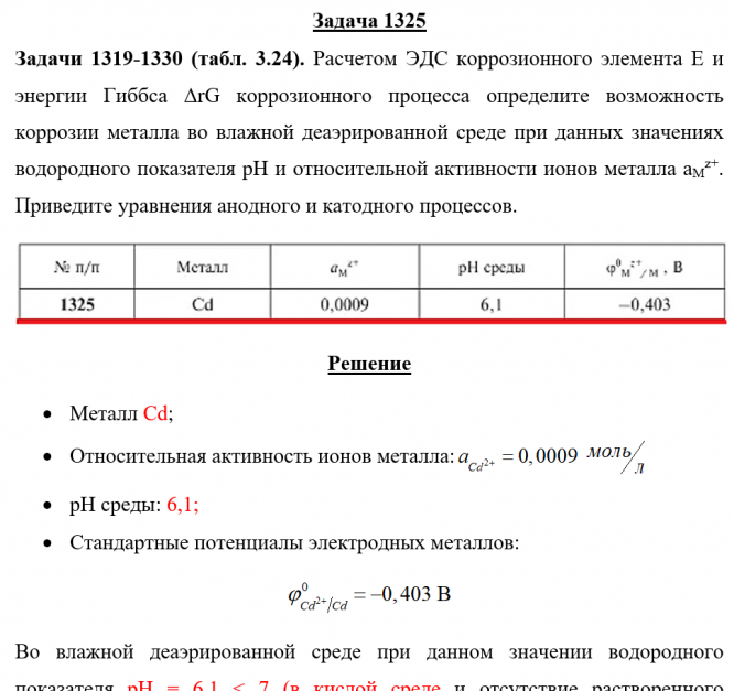 Задачи 1319-1330 (табл. 3.24). Расчетом ЭДС коррозионного элемента Е и энергии Гиббса ΔrG коррозионного процесса определите возможность коррозии металла во влажной деаэрированной среде при данных значениях водородного показателя рН и относительной активности ионов металла аМz+. Приведите уравнения анодного и катодного процессов..