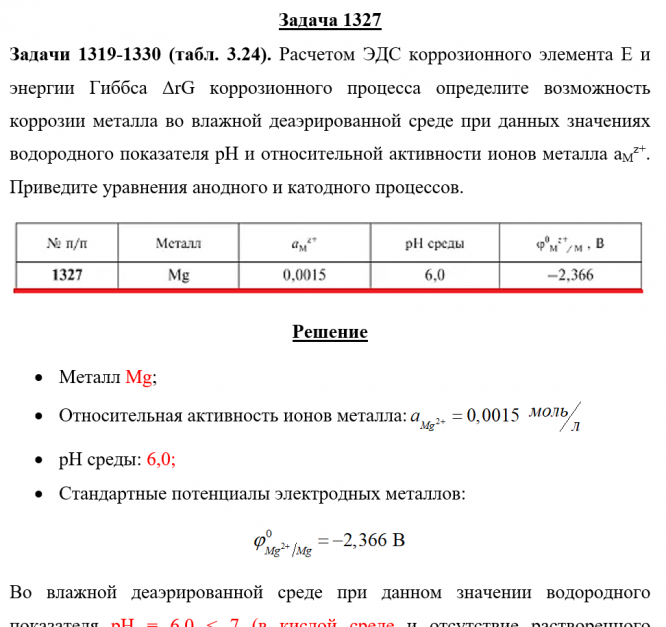 Главная » Учебные материалы » Химия » Решения задач » Несколько классов/семестров » Номер 1327 » Задача 1327 - Расчетом ЭДС коррозионного элемента Е и энергии Гиббса ΔrG коррозионного процесса определите возможность коррозии металла во влажной деаэрированной среде при данных значениях водородного показателя рН и относительной активности ионов ме