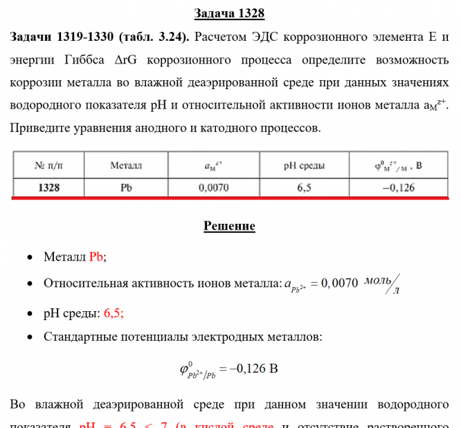 Главная » Учебные материалы » Химия » Решения задач » Несколько классов/семестров » Номер 1328 » Задача 1328 - Расчетом ЭДС коррозионного элемента Е и энергии Гиббса ΔrG коррозионного процесса определите возможность коррозии металла во влажной деаэрированной среде при данных значениях водородного показателя рН и относительной активности ионов ме