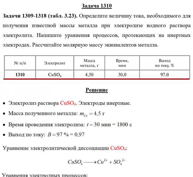 Задача 1310 - Определите величину тока, необходимого для получения известной массы металла при электролизе водного раствора электролита. Напишите уравнения процессов, протекающих на инертных электродах. Рассчитайте молярную массу эквивалентов металла