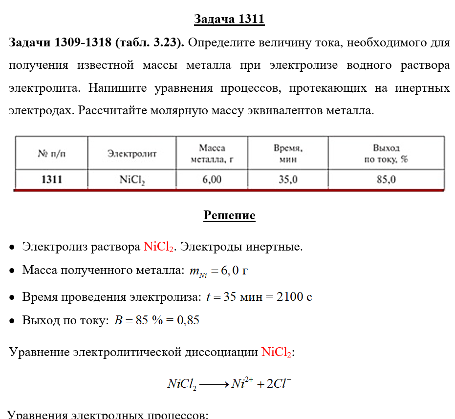 Задача 1311 - Определите величину тока, необходимого для получения известной массы металла при электролизе водного раствора электролита. Напишите уравнения процессов, протекающих на инертных электродах. Рассчитайте молярную массу эквивалентов металла