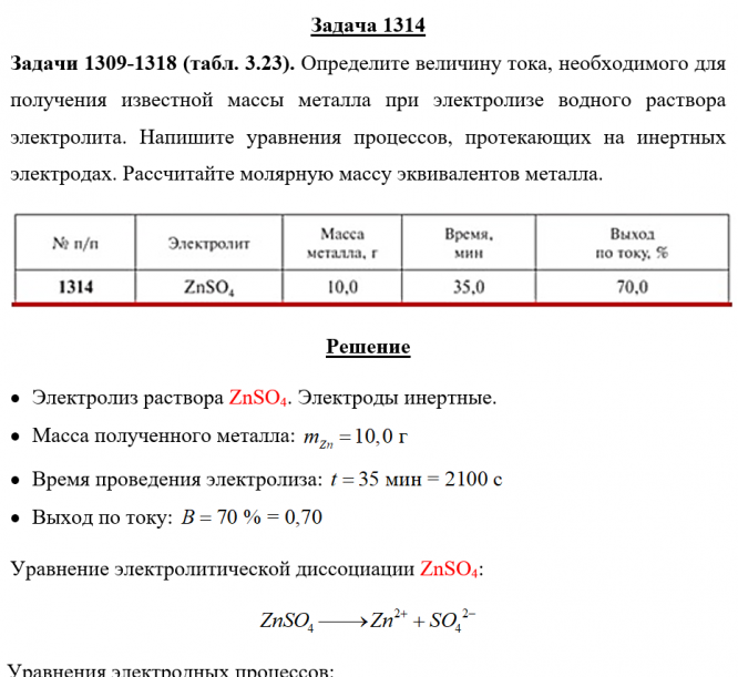 Задача 1314 - Определите величину тока, необходимого для получения известной массы металла при электролизе водного раствора электролита. Напишите уравнения процессов, протекающих на инертных электродах. Рассчитайте молярную массу эквивалентов металла