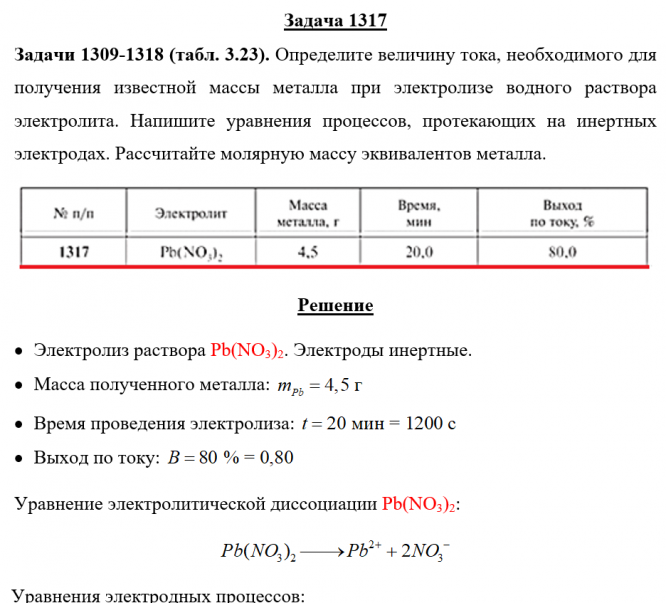 Задача 1317 - Определите величину тока, необходимого для получения известной массы металла при электролизе водного раствора электролита. Напишите уравнения процессов, протекающих на инертных электродах. Рассчитайте молярную массу эквивалентов металла