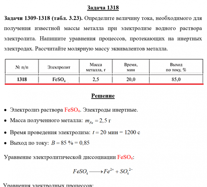Задача 1318 - Определите величину тока, необходимого для получения известной массы металла при электролизе водного раствора электролита. Напишите уравнения процессов, протекающих на инертных электродах. Рассчитайте молярную массу эквивалентов металла