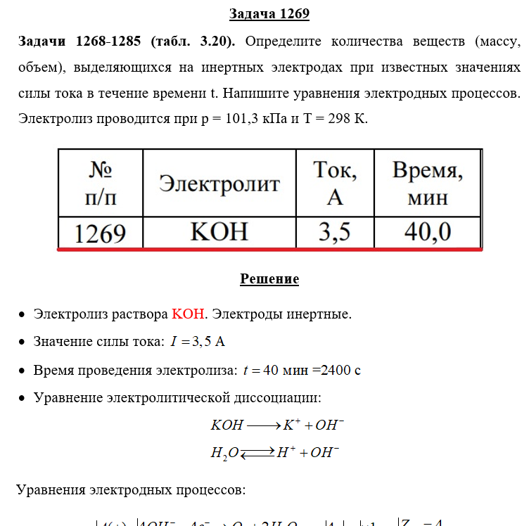 Задачи 1268-1285 (табл. 3.20). Определите количества веществ (массу, объем), выделяющихся на инертных электродах при известных значениях силы тока в течение времени t. Напишите уравнения электродных процессов. Электролиз проводится при p = 101,3 кПа и T = 298 К.
