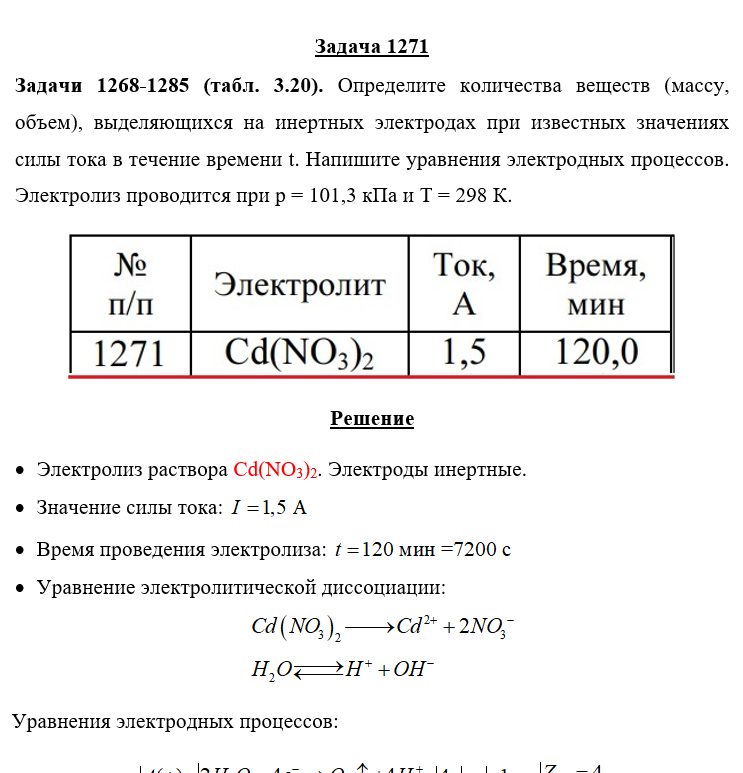 Задача 1271 - Определите количества веществ (массу, объем), выделяющихся на инертных электродах при известных значениях силы тока в течение времени t. Напишите уравнения электродных процессов. Электролиз проводится при p = 101,3 кПа и T = 298 К.