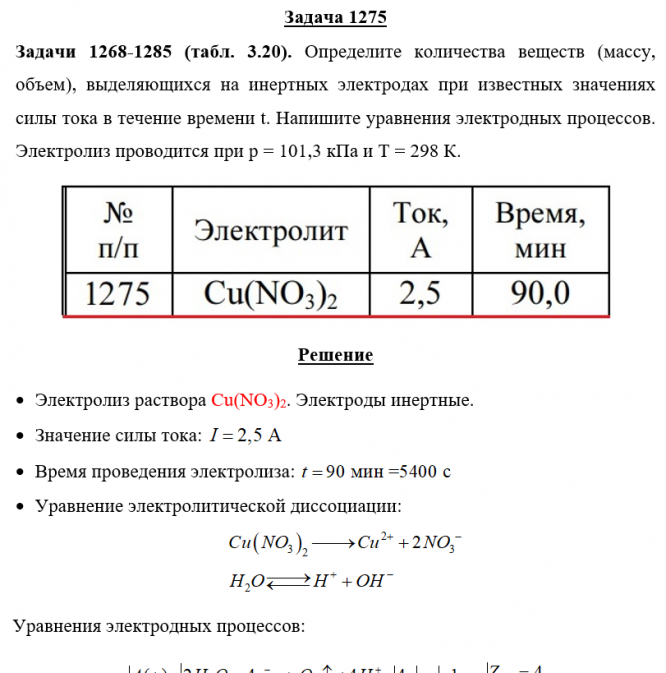 Задача 1275 - Определите количества веществ (массу, объем), выделяющихся на инертных электродах при известных значениях силы тока в течение времени t. Напишите уравнения электродных процессов. Электролиз проводится при p = 101,3 кПа и T = 298 К.