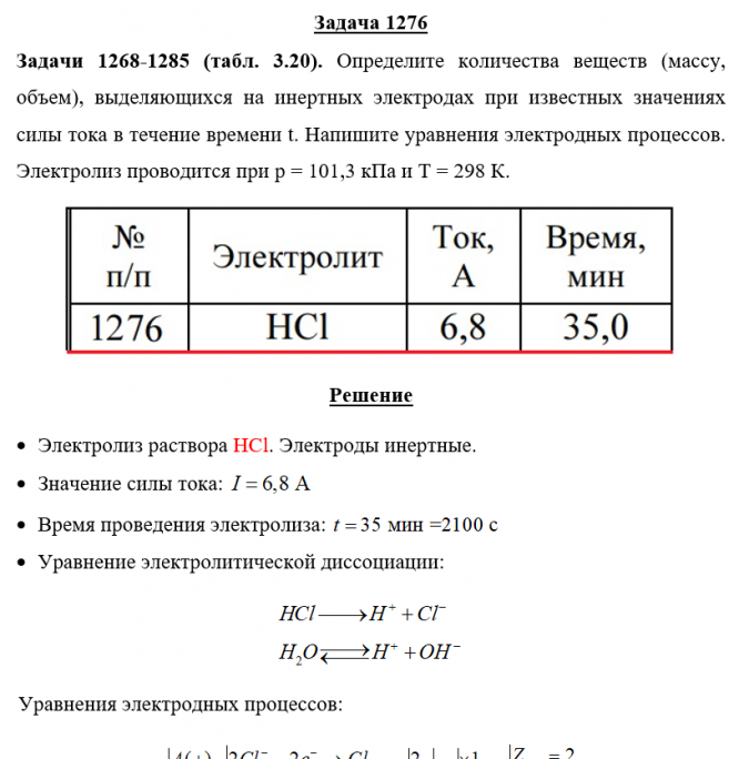 Задачи 1268-1285 (табл. 3.20). Определите количества веществ (массу, объем), выделяющихся на инертных электродах при известных значениях силы тока в течение времени t. Напишите уравнения электродных процессов. Электролиз проводится при p = 101,3 кПа и T = 298 К.