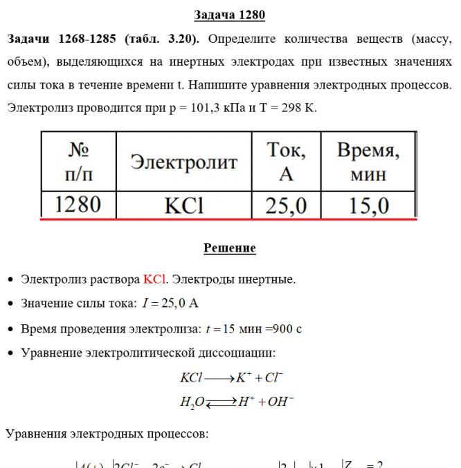 Задачи 1268-1285 (табл. 3.20). Определите количества веществ (массу, объем), выделяющихся на инертных электродах при известных значениях силы тока в течение времени t. Напишите уравнения электродных процессов. Электролиз проводится при p = 101,3 кПа и T = 298 К.