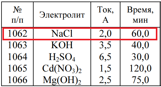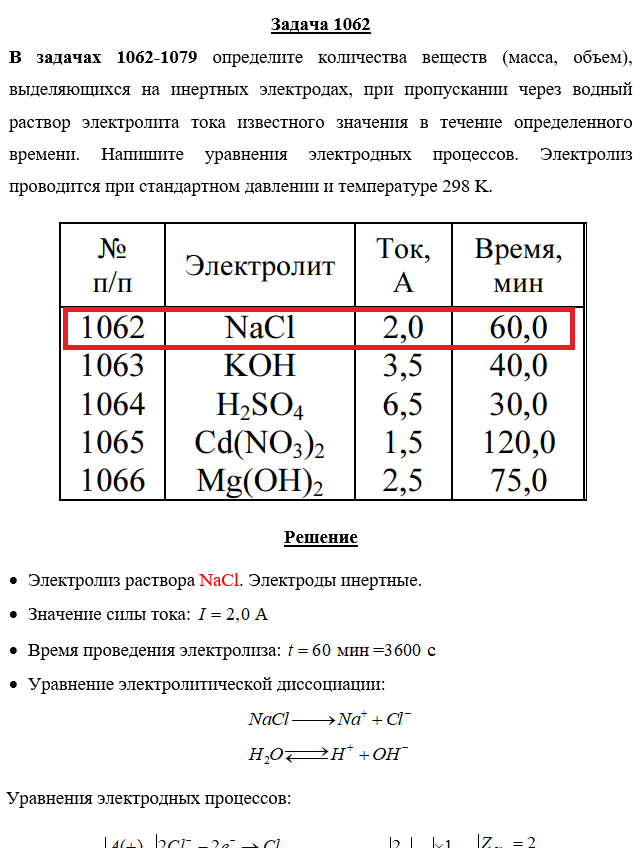 Задача 1062 - определите количества веществ (масса, объем), выделяющихся на инертных электродах, при пропускании через водный раствор электролита тока известного значения в течение определенного времени. Напишите уравнения электродных процессов. Элек