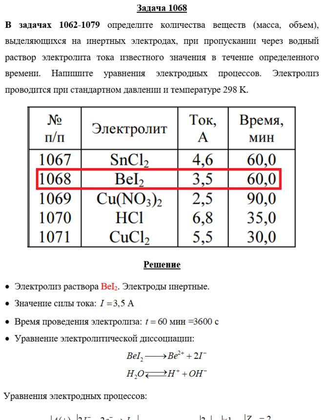 Задача 1068 - определите количества веществ (масса, объем), выделяющихся на инертных электродах, при пропускании через водный раствор электролита тока известного значения в течение определенного времени. Напишите уравнения электродных процессов. Элек