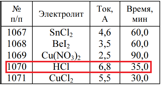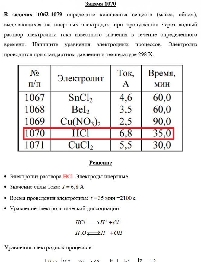 Задача 1070 - определите количества веществ (масса, объем), выделяющихся на инертных электродах, при пропускании через водный раствор электролита тока известного значения в течение определенного времени. Напишите уравнения электродных процессов. Элек