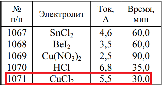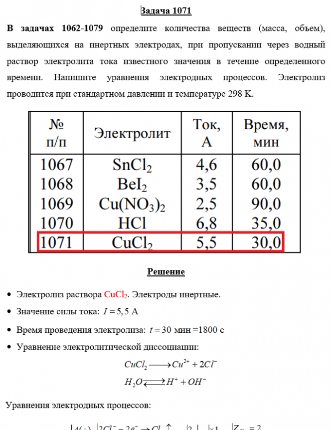 Задача 1071 - определите количества веществ (масса, объем), выделяющихся на инертных электродах, при пропускании через водный раствор электролита тока известного значения в течение определенного времени. Напишите уравнения электродных процессов. Элек