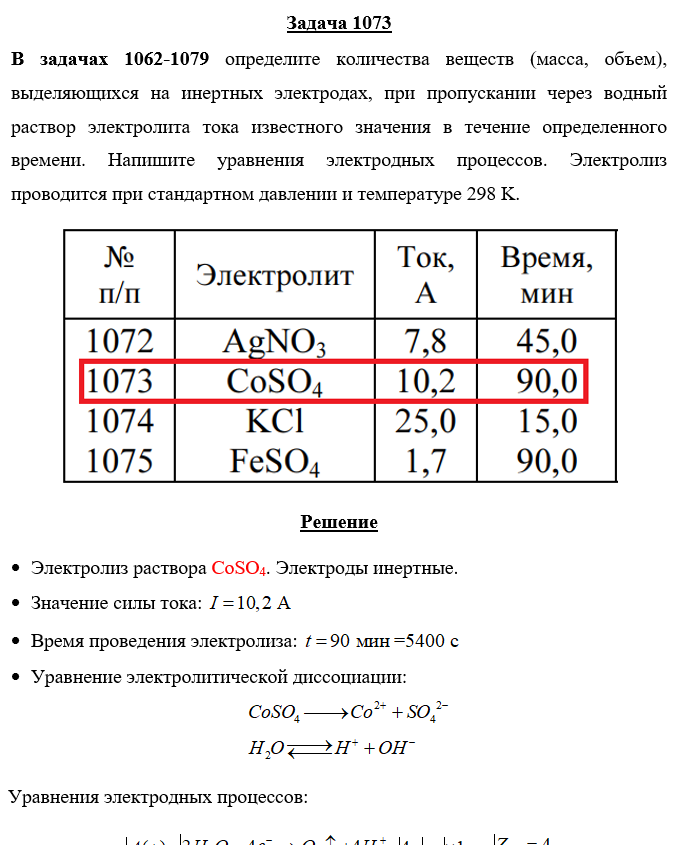 Задача 1073 - определите количества веществ (масса, объем), выделяющихся на инертных электродах, при пропускании через водный раствор электролита тока известного значения в течение определенного времени. Напишите уравнения электродных процессов. Элек