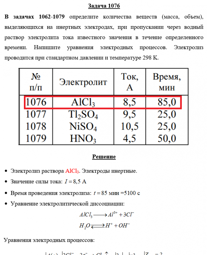 Задача 1076 - определите количества веществ (масса, объем), выделяющихся на инертных электродах, при пропускании через водный раствор электролита тока известного значения в течение определенного времени. Напишите уравнения электродных процессов. Элек