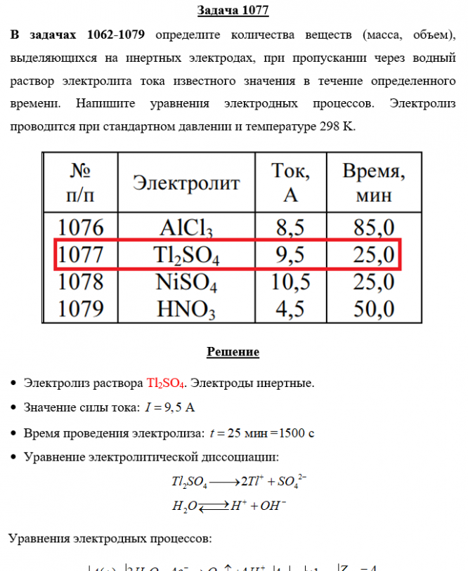 Задача 1077 - определите количества веществ (масса, объем), выделяющихся на инертных электродах, при пропускании через водный раствор электролита тока известного значения в течение определенного времени. Напишите уравнения электродных процессов. Элек