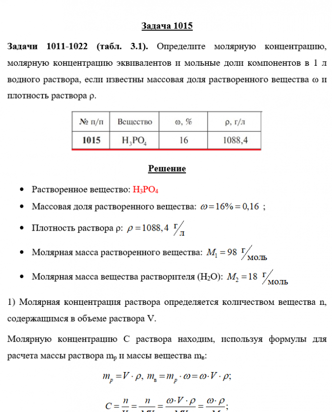 Задача 1015 - Определите молярную концентрацию, молярную концентрацию эквивалентов и мольные доли компонентов в 1 л водного раствора, если известны массовая доля растворенного вещества ω и плотность раствора ρ.
