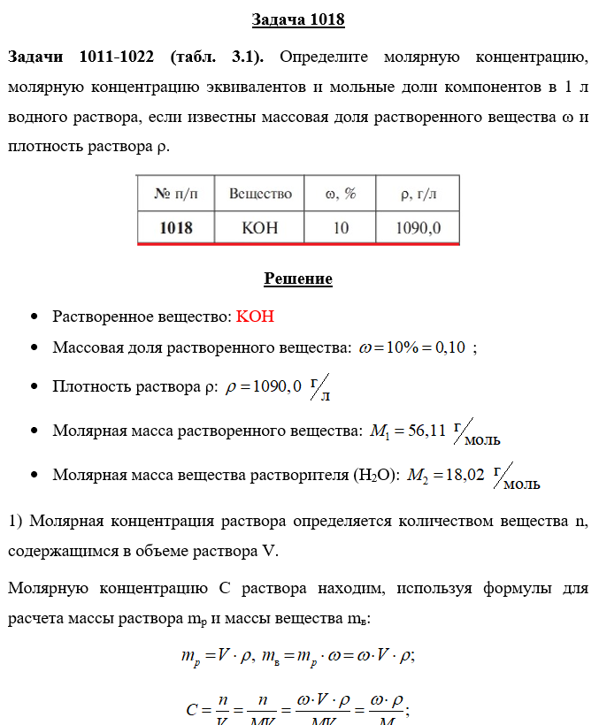 Задача 1018 - Определите молярную концентрацию, молярную концентрацию эквивалентов и мольные доли компонентов в 1 л водного раствора, если известны массовая доля растворенного вещества ω и плотность раствора ρ.