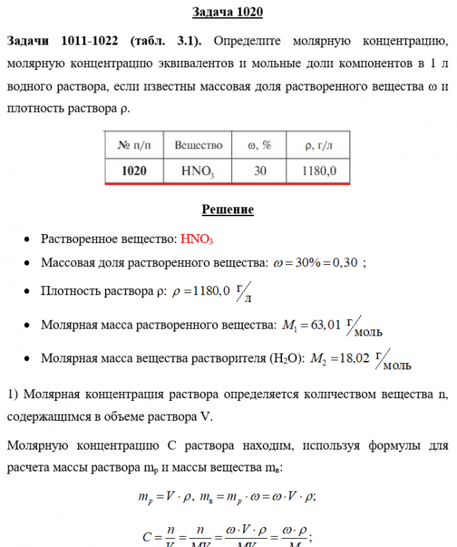 Задача 1020 - Определите молярную концентрацию, молярную концентрацию эквивалентов и мольные доли компонентов в 1 л водного раствора, если известны массовая доля растворенного вещества ω и плотность раствора ρ.