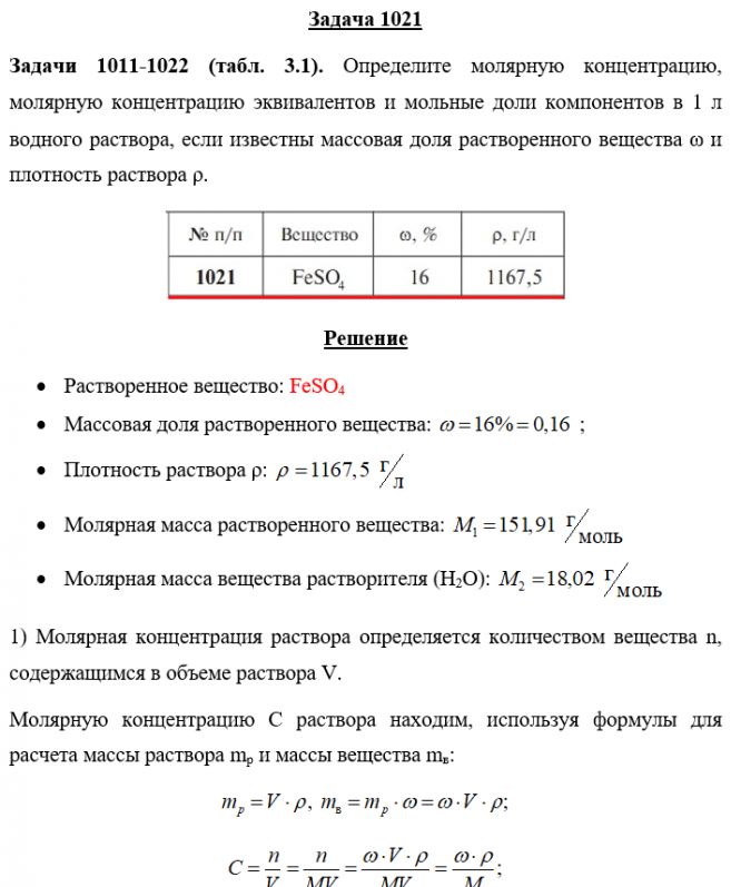 Задача 1021 - Определите молярную концентрацию, молярную концентрацию эквивалентов и мольные доли компонентов в 1 л водного раствора, если известны массовая доля растворенного вещества ω и плотность раствора ρ.