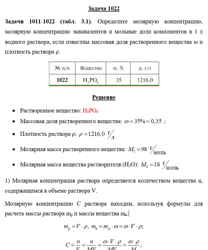 Задача 1022 - Определите молярную концентрацию, молярную концентрацию эквивалентов и мольные доли компонентов в 1 л водного раствора, если известны массовая доля растворенного вещества ω и плотность раствора ρ.