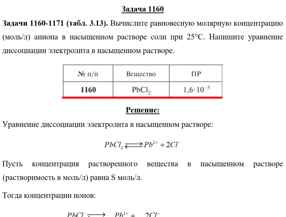 Задачи 1160-1171 (табл. 3.13). Вычислите равновесную молярную концентрацию (моль/л) аниона в насыщенном растворе соли при 25°С. Напишите уравнение диссоциации электролита в насыщенном растворе.