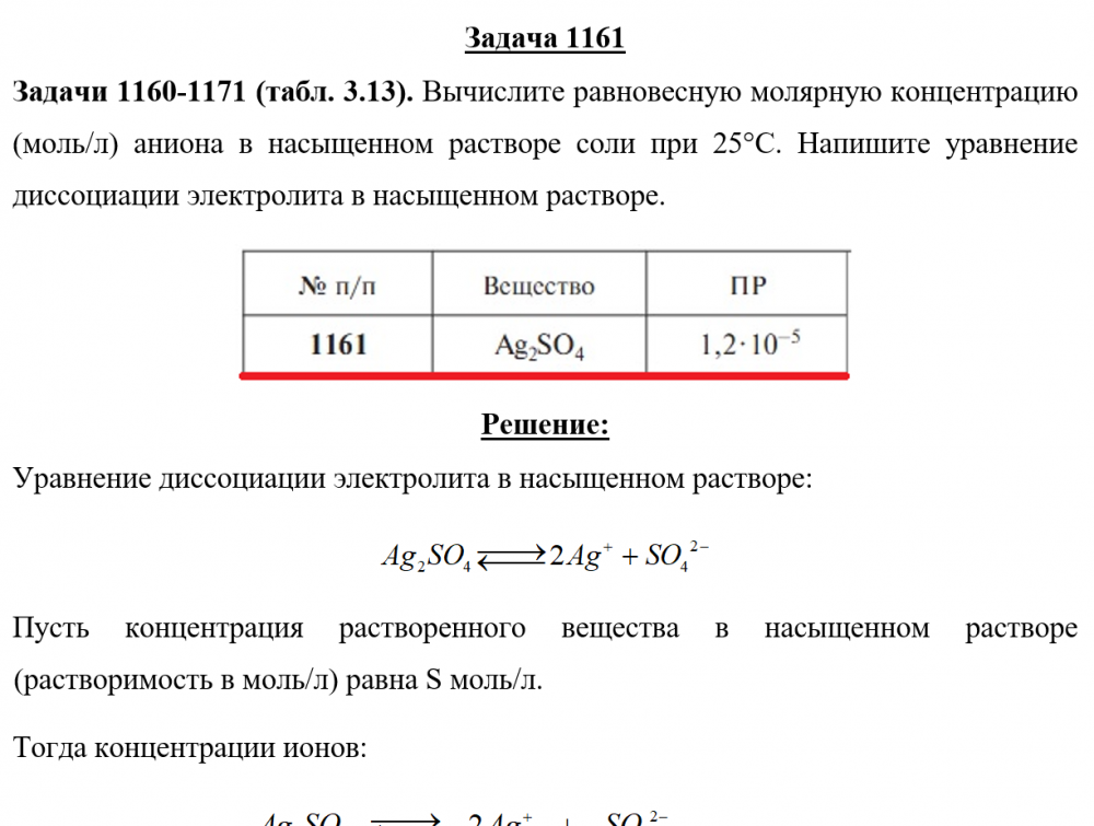 Задача 1161 - Вычислите равновесную молярную концентрацию (моль/л) аниона в насыщенном растворе соли при 25°С. Напишите уравнение диссоциации электролита в насыщенном растворе.