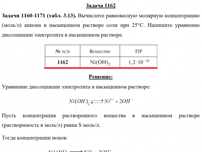 Главная » Учебные материалы » Химия » Решения задач » Несколько классов/семестров » Номер 1162 » Задача 1162 - Вычислите равновесную молярную концентрацию (моль/л) аниона в насыщенном растворе соли при 25°С. Напишите уравнение диссоциации электролита в насыщенном растворе.