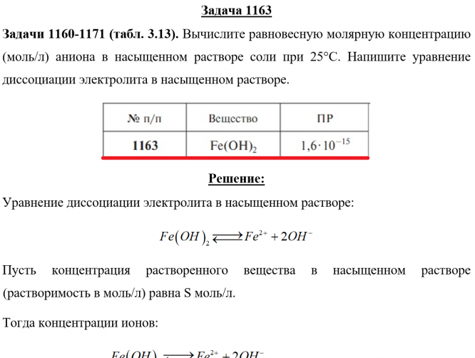 Главная » Учебные материалы » Химия » Решения задач » Несколько классов/семестров » Номер 1163 » Задача 1163 - Вычислите равновесную молярную концентрацию (моль/л) аниона в насыщенном растворе соли при 25°С. Напишите уравнение диссоциации электролита в насыщенном растворе.