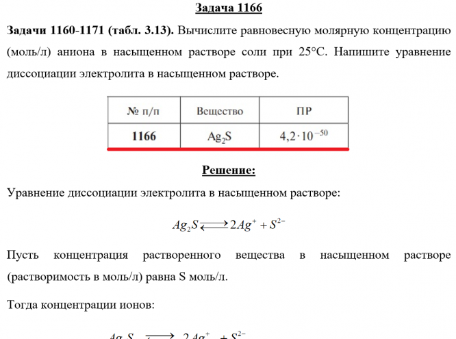 Главная » Учебные материалы » Химия » Решения задач » Несколько классов/семестров » Номер 1166 » Задача 1166 - Вычислите равновесную молярную концентрацию (моль/л) аниона в насыщенном растворе соли при 25°С. Напишите уравнение диссоциации электролита в насыщенном растворе.