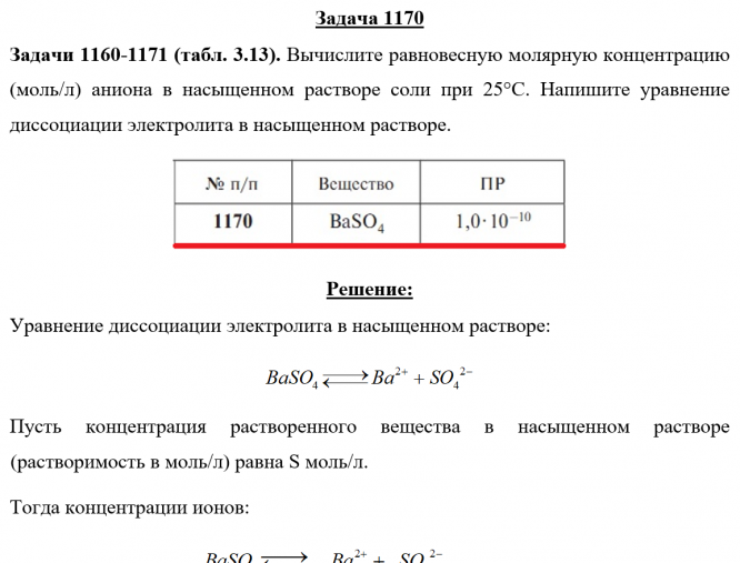 Главная » Учебные материалы » Химия » Решения задач » Несколько классов/семестров » Номер 1170 » Задача 1170 - Вычислите равновесную молярную концентрацию (моль/л) аниона в насыщенном растворе соли при 25°С. Напишите уравнение диссоциации электролита в насыщенном растворе.