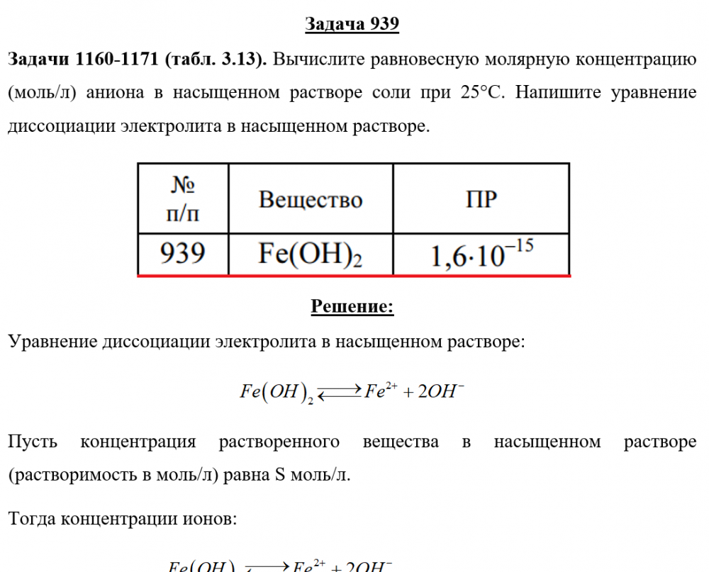 Для студентов по предмету ХимияЗадача 939 - вычислите равновесную молярную концентрацию (моль/л) аниона в насыщенном растворе соли при температуре 25 °С. Напишите уравнение диссоциаЗадача 939 - вычислите равновесную молярную концентрацию (моль/л) аниона в насыщенном растворе соли при температуре 25 °С. Напишите уравнение диссоциа