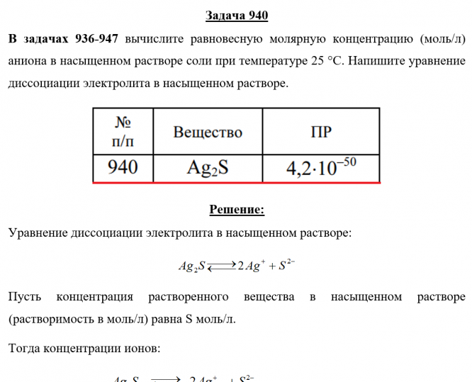Главная » Учебные материалы » Химия » Решения задач » Несколько классов/семестров » Номер 940 » Задача 940 - вычислите равновесную молярную концентрацию (моль/л) аниона в насыщенном растворе соли при температуре 25 °С. Напишите уравнение диссоциации электролита в насыщенном растворе.