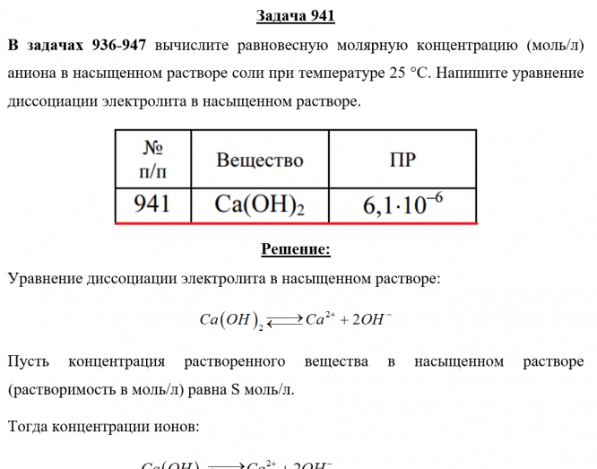 Главная » Учебные материалы » Химия » Решения задач » Несколько классов/семестров » Номер 941 » Задача 941 - вычислите равновесную молярную концентрацию (моль/л) аниона в насыщенном растворе соли при температуре 25 °С. Напишите уравнение диссоциации электролита в насыщенном растворе.