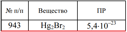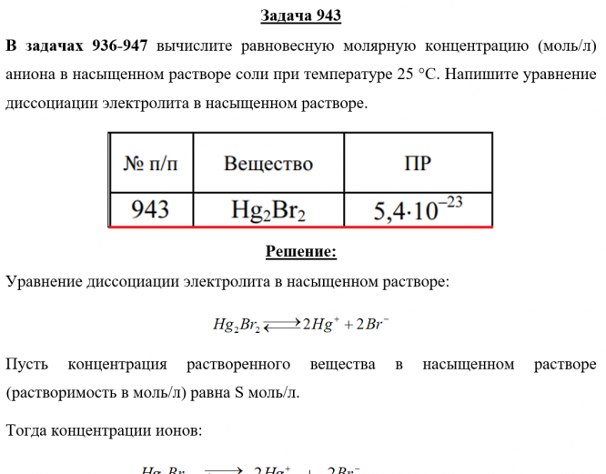 Задача 943 - вычислите равновесную молярную концентрацию (моль/л) аниона в насыщенном растворе соли при температуре 25 °С. Напишите уравнение диссоциации электролита в насыщенном растворе.