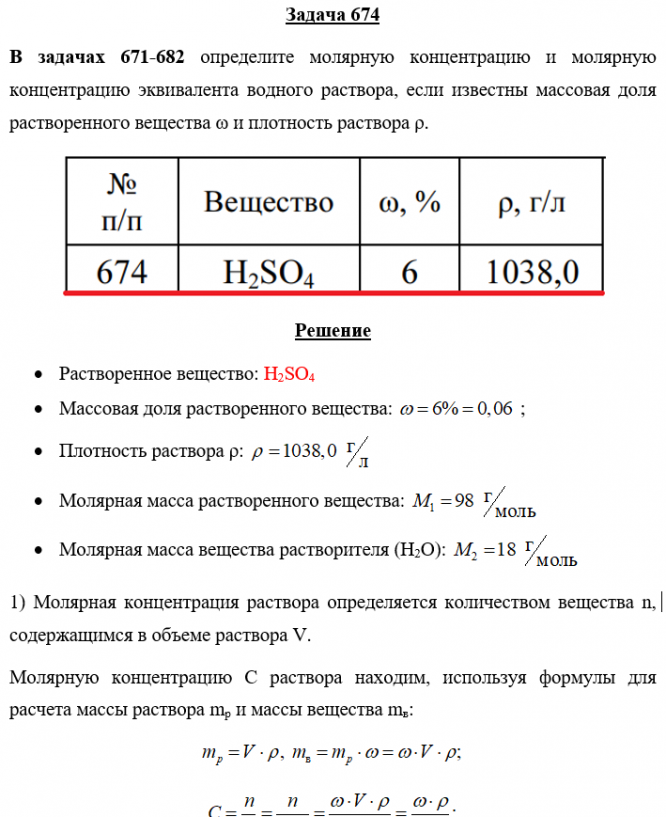 Задача 674 - определите молярную концентрацию и молярную концентрацию эквивалента водного раствора, если известны массовая доля растворенного вещества ω и плотность раствора ρ.