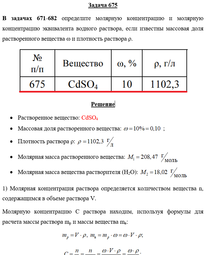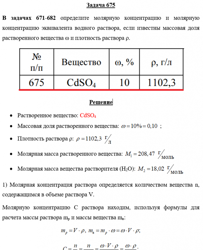 Задача 675 - определите молярную концентрацию и молярную концентрацию эквивалента водного раствора, если известны массовая доля растворенного вещества ω и плотность раствора ρ.