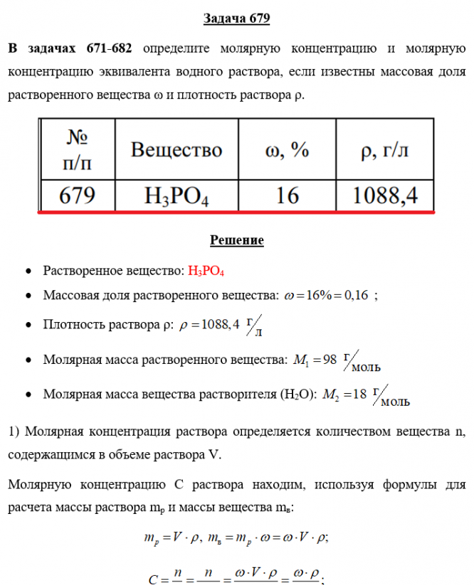 Задача 679 - определите молярную концентрацию и молярную концентрацию эквивалента водного раствора, если известны массовая доля растворенного вещества ω и плотность раствора ρ.