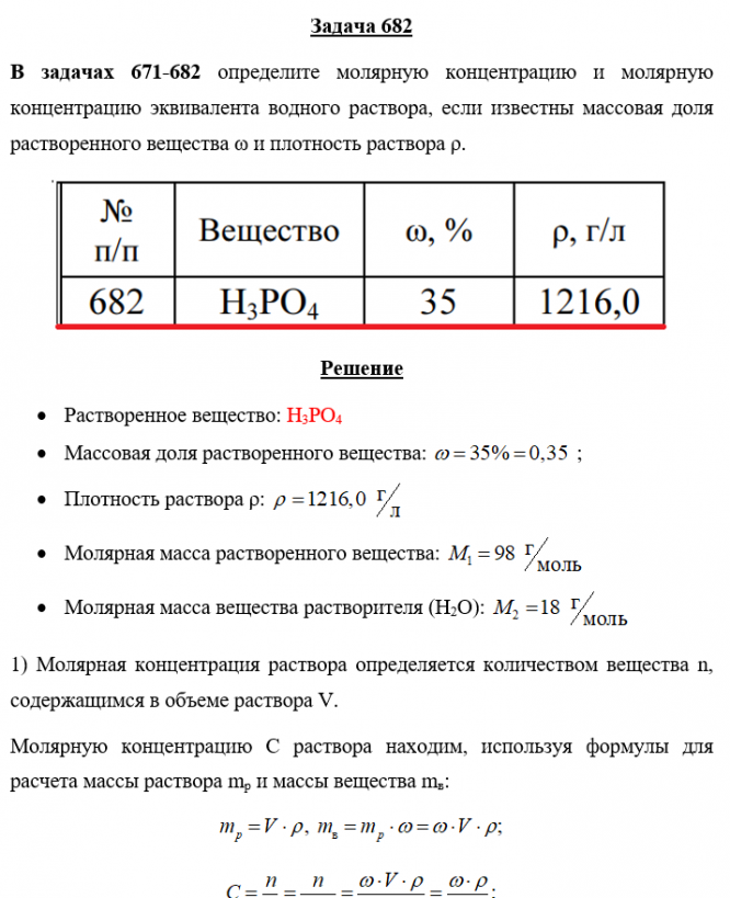 Задача 682 - определите молярную концентрацию и молярную концентрацию эквивалента водного раствора, если известны массовая доля растворенного вещества ω и плотность раствора ρ.