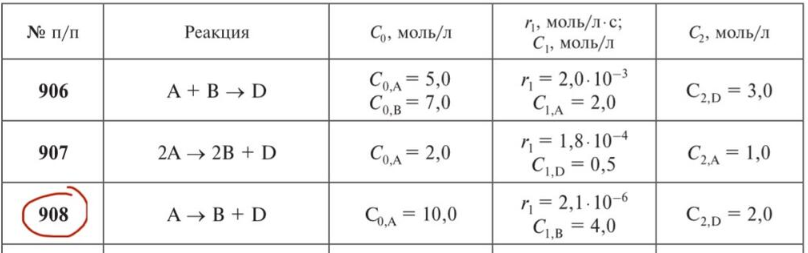 Задачи 906–915 (табл. 2.14). Для условной элементарной реакции рассчитайте скорость реакции r2 при указанной концентрации С2 одного из компонентов, если известны начальные концентрации реагентов С0 и скорость реакции r1 при определенной концентрации одного из компонентов С1.