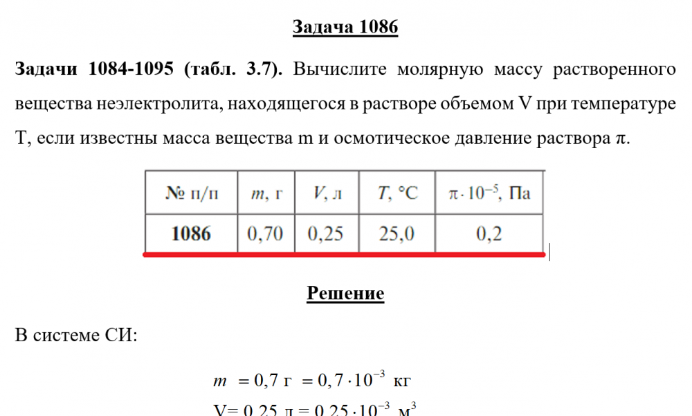 Задачи 1084-1095 (табл. 3.7). Вычислите молярную массу растворенного вещества неэлектролита, находящегося в растворе объемом V при температуре Т, если известны масса вещества m и осмотическое давление раствора π..